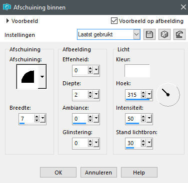 Ga naar Effecten, Afschuining binnen, Keuze 2, Breedte 7, Afbeelding: 0 – 2 – 0 – 0, Licht: Wit, 315 – 50 – 30