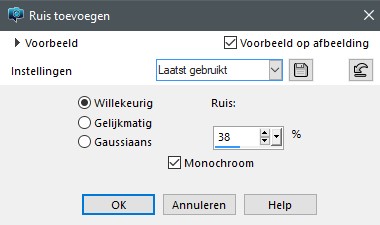 Ga naar Aanpassen, Ruis toevoegen, Ruis 38%, Willekeurig en Monochroom aangevinkt
